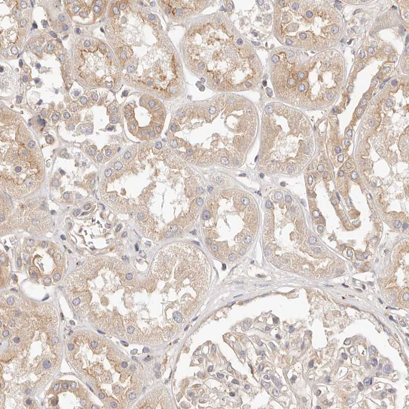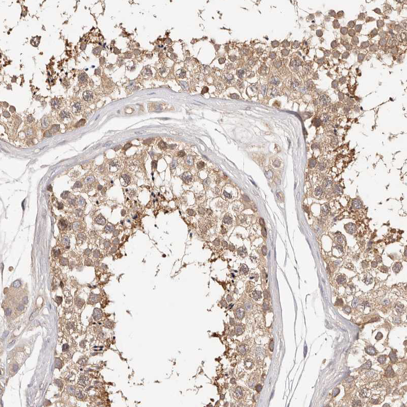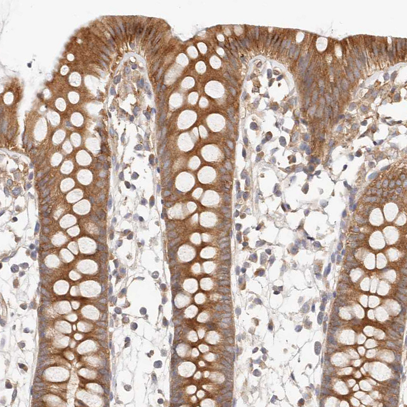 Immunohistochemical staining of human colon, kidney, liver and testis using Anti-KCMF1 antibody HPA030383 (A) shows similar protein distribution across tissues to independent antibody HPA030384 (B).