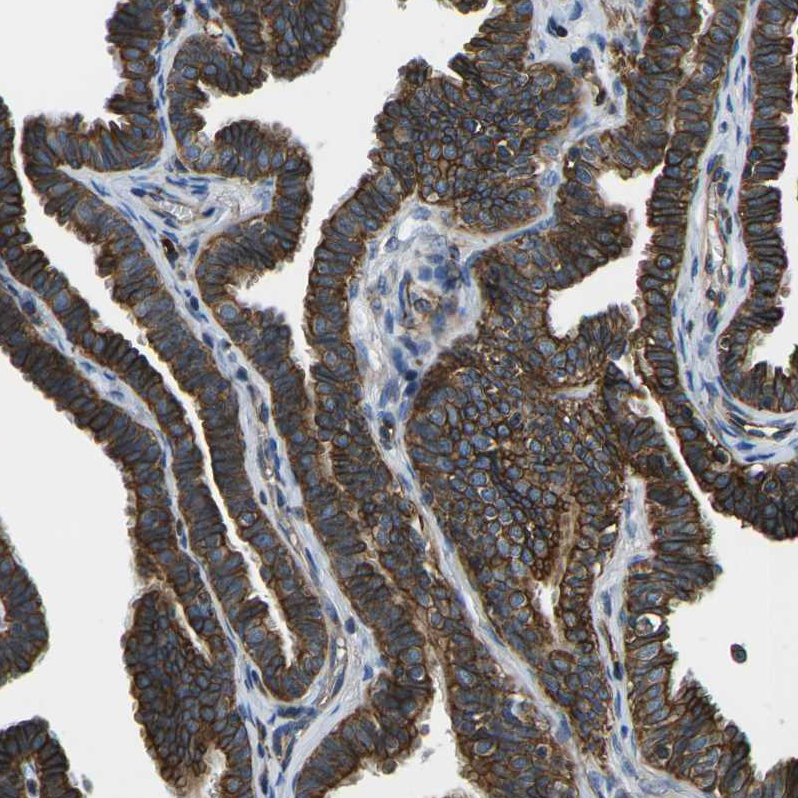 Immunohistochemical staining of human kidney shows strong membranous/cytoplasmic positivity in cells in tubules.
