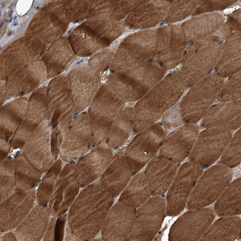 Immunohistochemical staining of human heart muscle shows strong cytoplasmic positivity in cardiomyocytes.