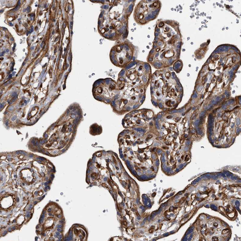Immunohistochemical staining of human prostate shows strong cytoplasmic positivity in smooth muscle cells.