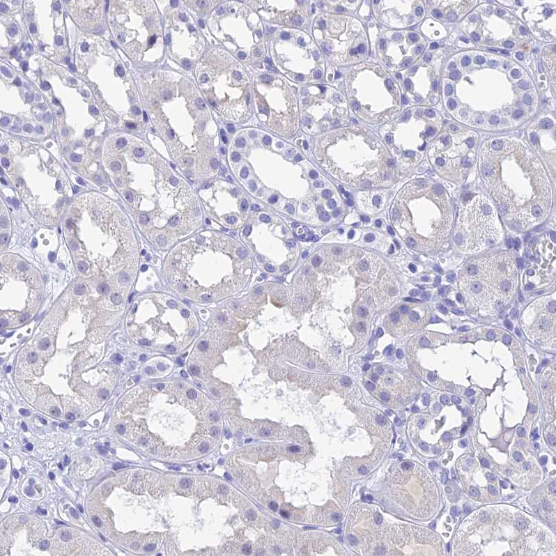 Immunohistochemical staining of human duodenum shows moderate cytoplasmic positivity in goblet cells.