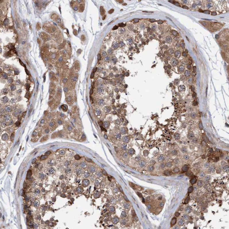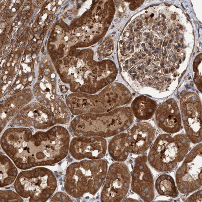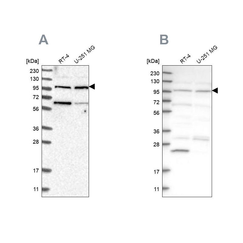 Immunohistochemical staining of human cerebral cortex, fallopian tube, kidney and testis using Anti-KIAA0753 antibody HPA023057 (A) shows similar protein distribution across tissues to independent antibody HPA023494 (B).
