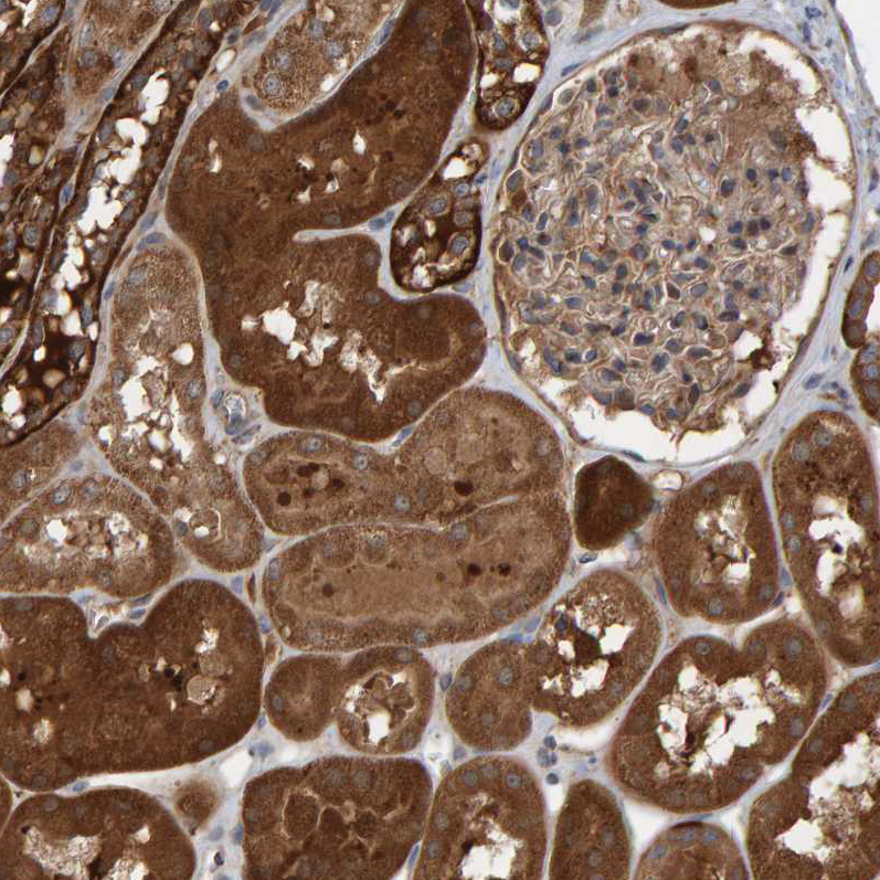 Immunohistochemical staining of human cerebral cortex, fallopian tube, kidney and testis using Anti-KIAA0753 antibody HPA023494 (A) shows similar protein distribution across tissues to independent antibody HPA023057 (B).