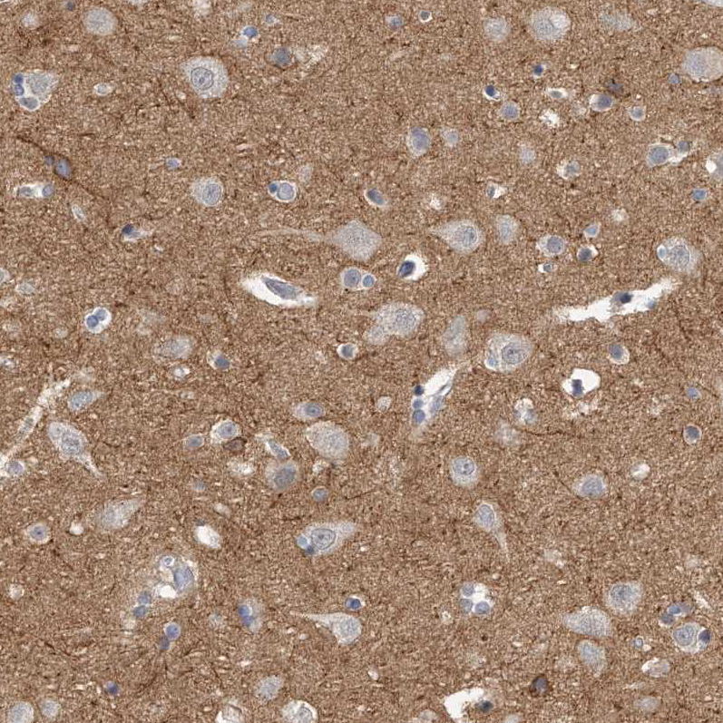 Immunohistochemical staining of human heart muscle shows strong positivity in intercalated discs.