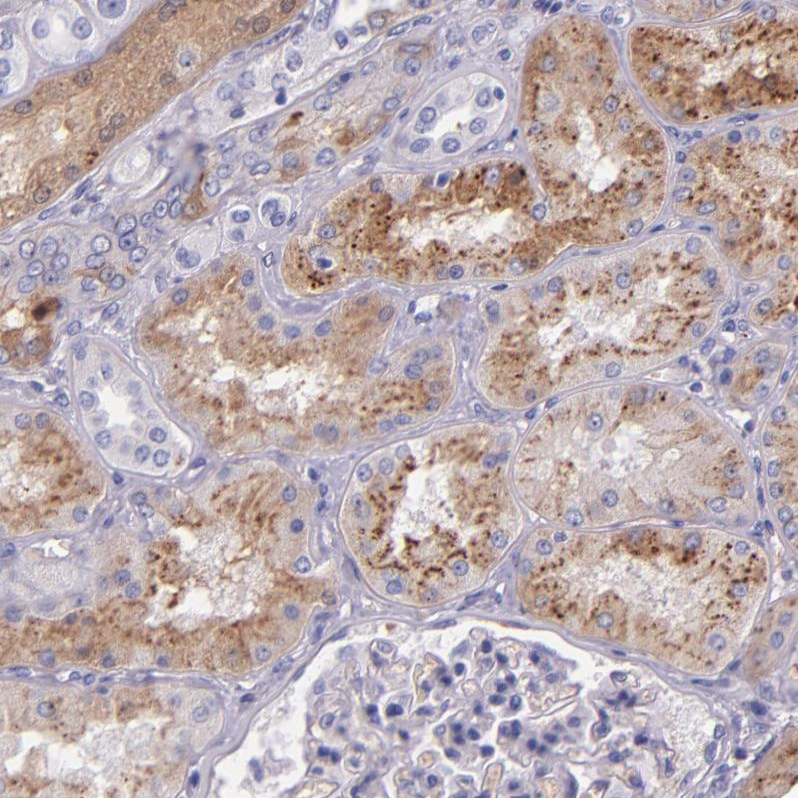 Immunohistochemical staining of human kidney, lymphoid tissues, pancreas and testis using Anti-KNG1 antibody HPA001616 (A) shows similar protein distribution across tissues to independent antibody HPA001645 (B).