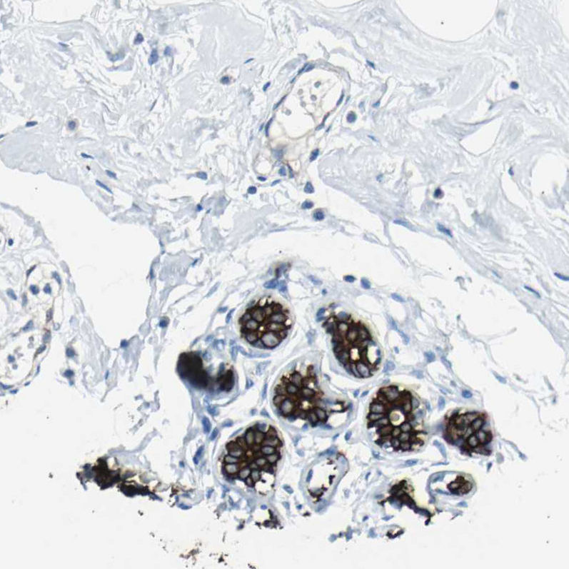 Immunohistochemistry analysis in human placenta and skeletal muscle tissues using HPA007272 antibody. Corresponding KRT7 RNA-seq data are presented for the same tissues.