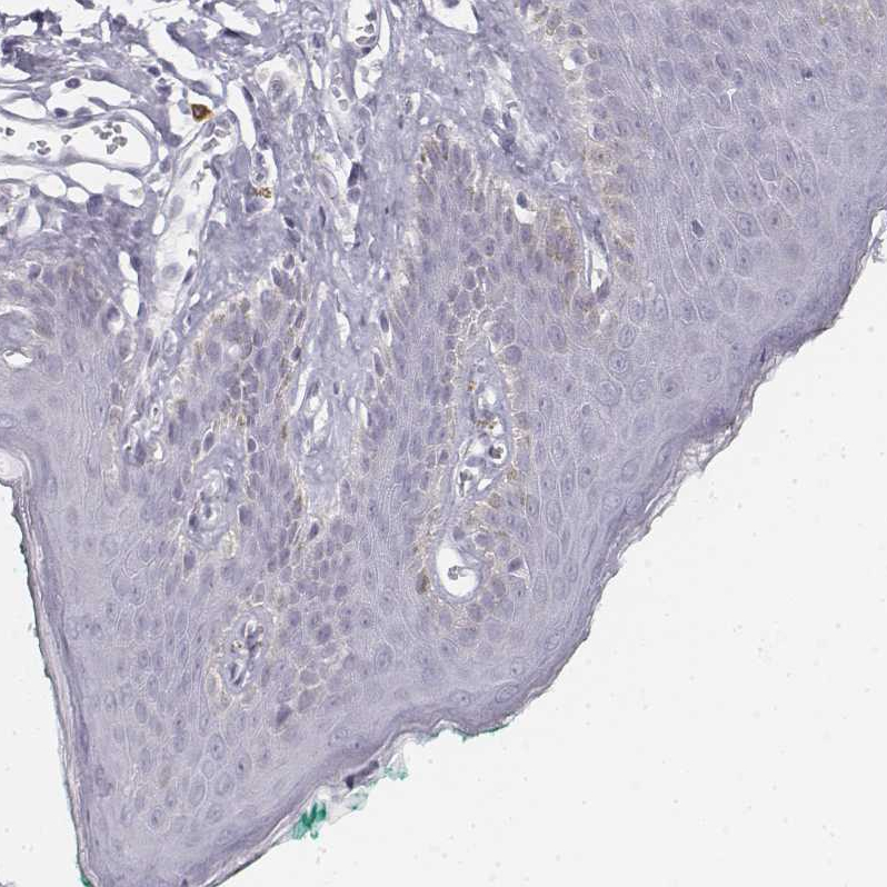 Immunohistochemical staining of human hair shows strong cytoplasmic positivity in cells in hair cortex.