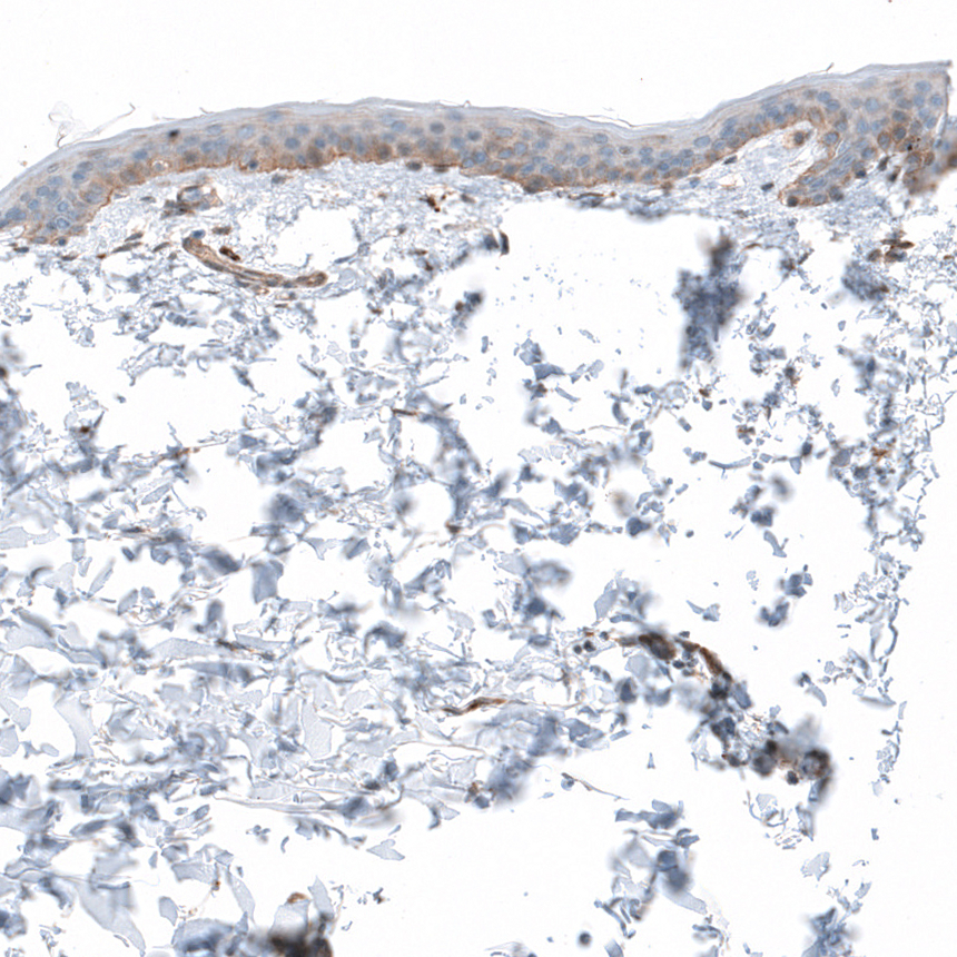 Immunohistochemical staining of human testis shows membranous positivity in basal membrane of seminiferous ducts.