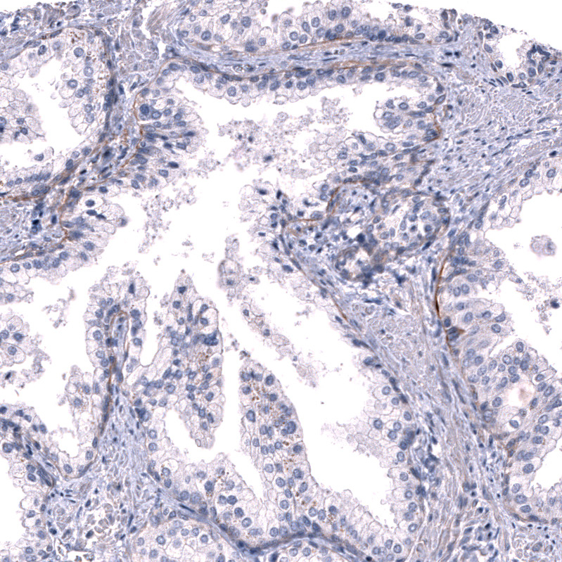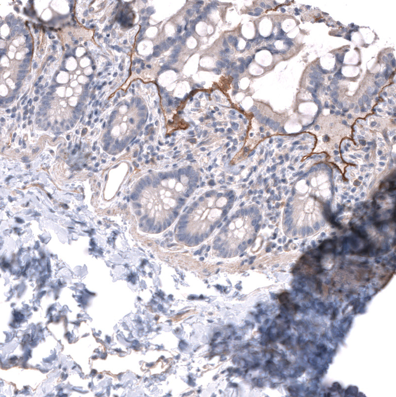 Immunohistochemical staining of human skin shows moderate positivity in basement membrane of epithelial cells.