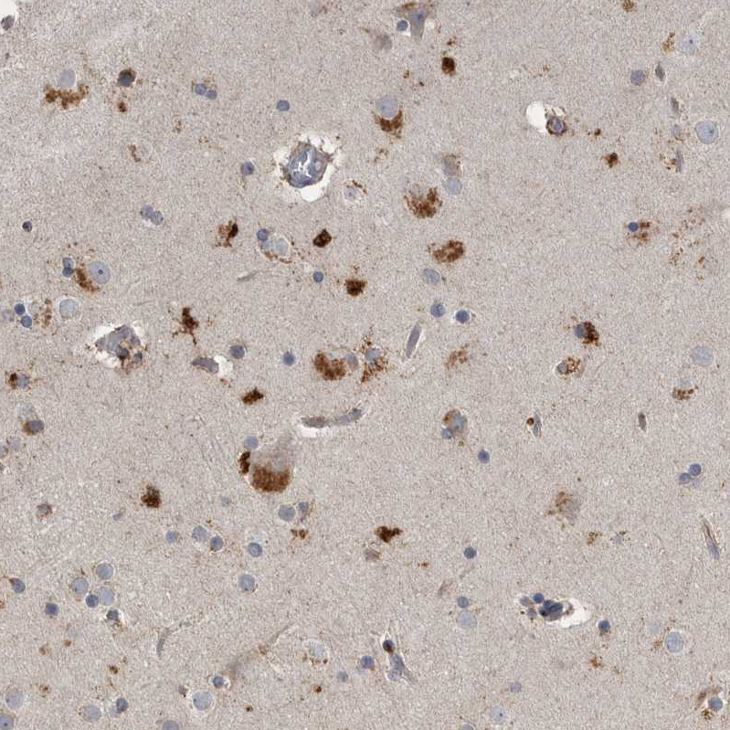Immunohistochemical staining of human kidney shows strong cytoplasmic granular positivity in cells in tubules.