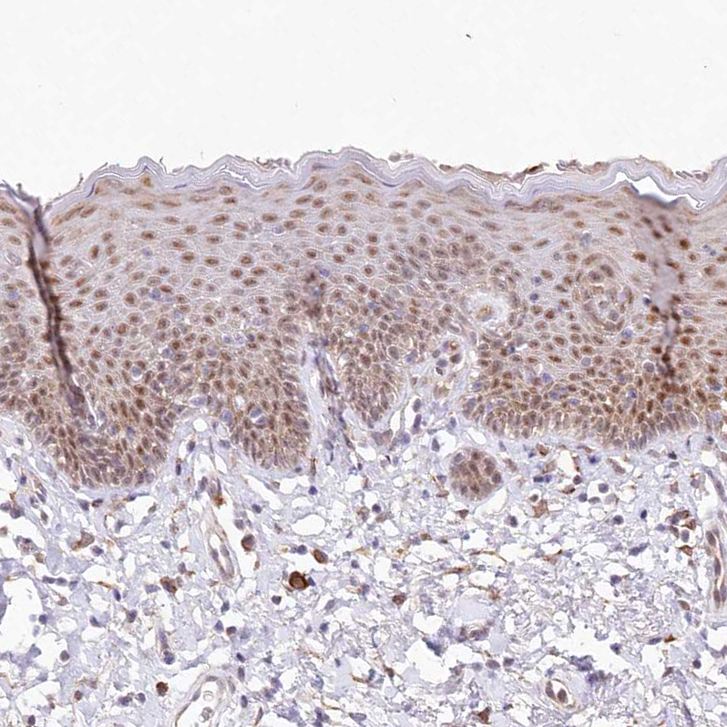 Immunohistochemical staining of human bone marrow shows strong nuclear positivity in a subset of hematopoietic cells.