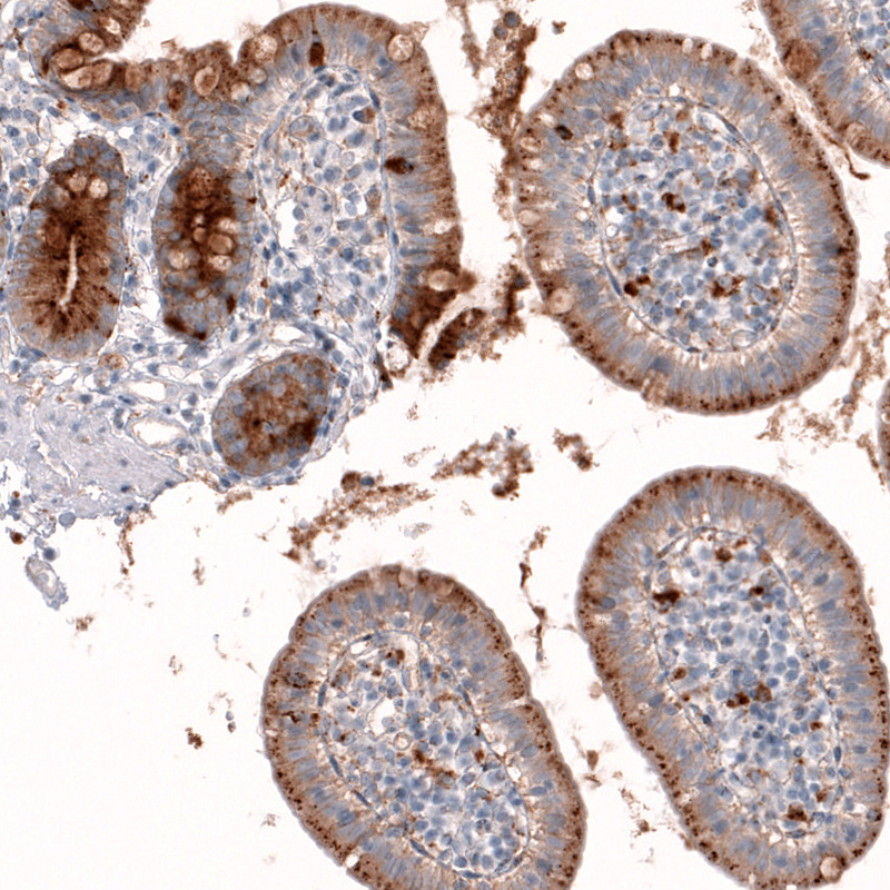 Immunohistochemical staining of human prostate shows strong cytoplasmic positivity in glandular cells.