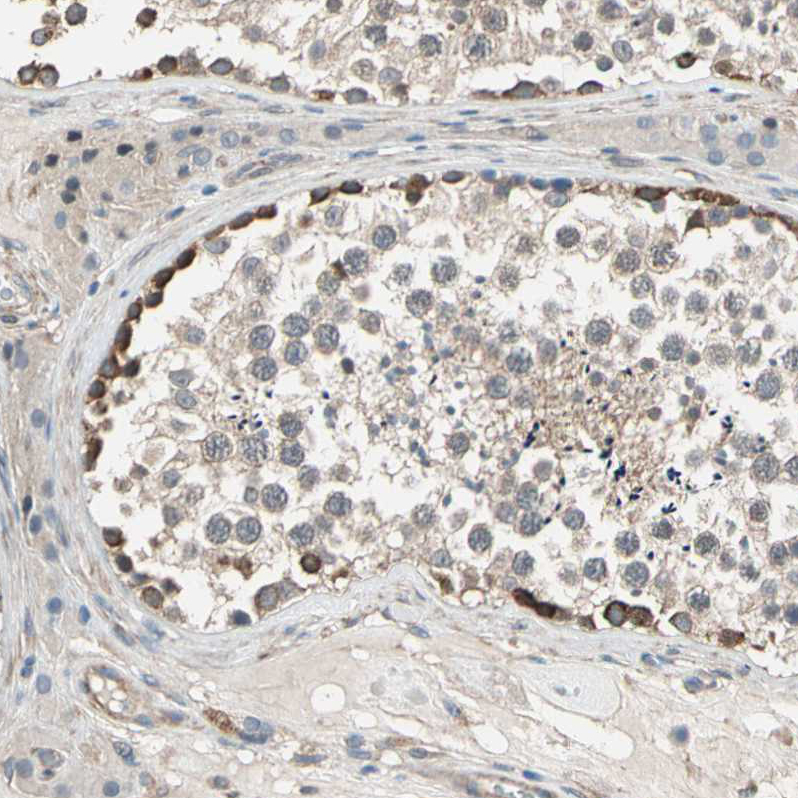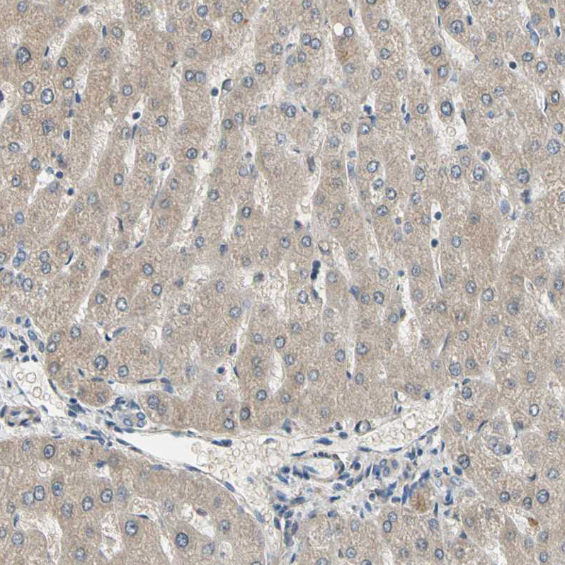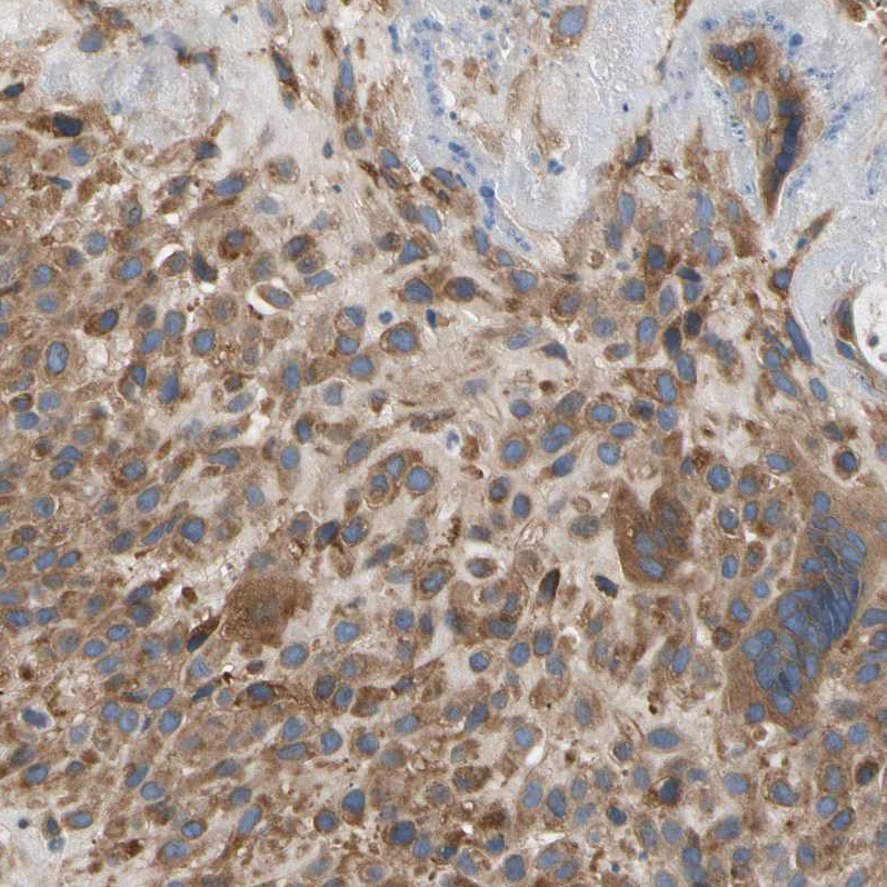Immunohistochemical staining of human placenta shows weak to moderate cytoplasmic positivity in trophoblastic cells.