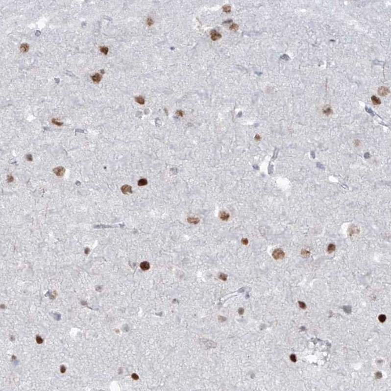 Immunohistochemical staining of human testis shows moderate nuclear positivity in cells in seminiferous ducts.