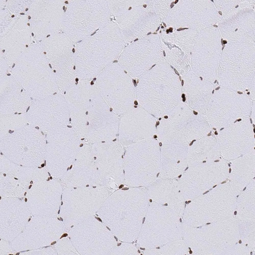 Immunohistochemistry analysis in human lymph node and skeletal muscle tissues using HPA050524 antibody. Corresponding LMNB1 RNA-seq data are presented for the same tissues.