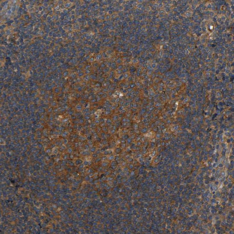 Immunohistochemical staining of human cerebellum shows moderate cytoplasmic positivity in Purkinje cells.
