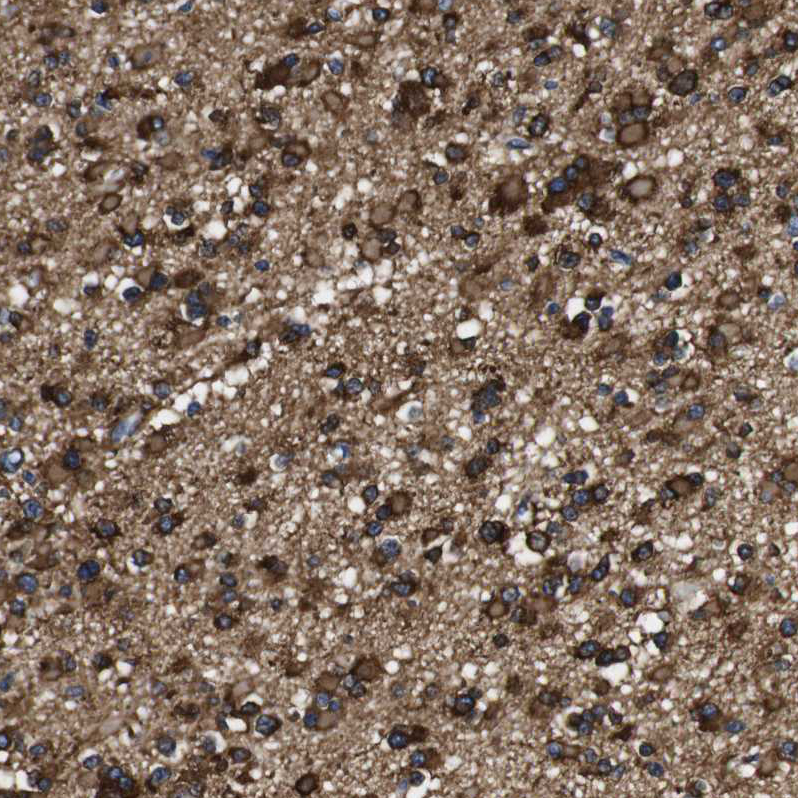 Immunohistochemical staining of human cerebellum shows very strong cytoplasmic positivity in Purkinje cells.