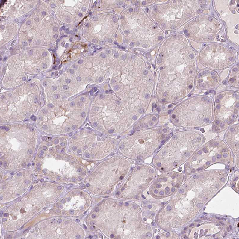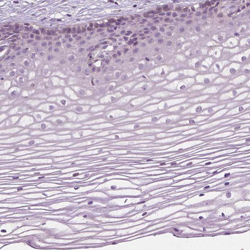 Immunohistochemical staining of human cerebral cortex shows weak cytoplasmic positivity in neurons.