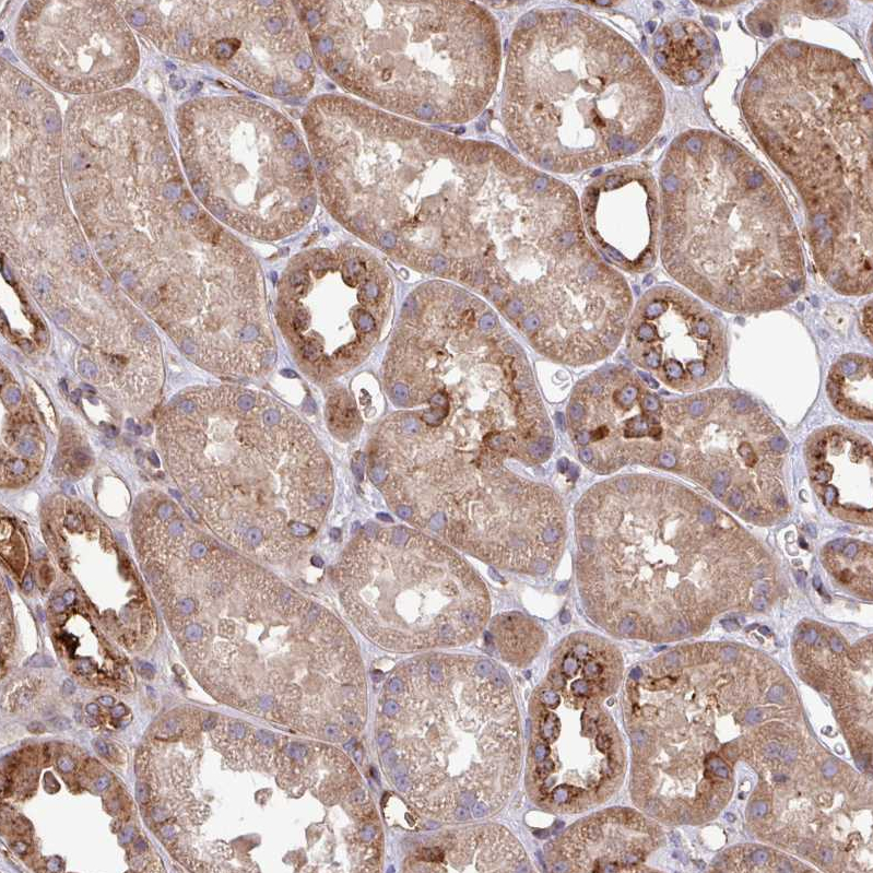 Immunohistochemical staining of human liver shows strong cytoplasmic/cytoplasmic granular positivity in hepatocytes.