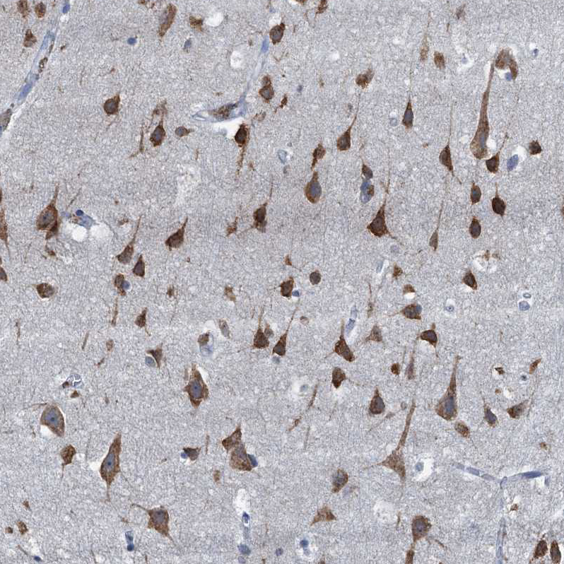 Immunohistochemical staining of human testis shows strong cytoplasmic positivity in cells in seminiferous ducts.