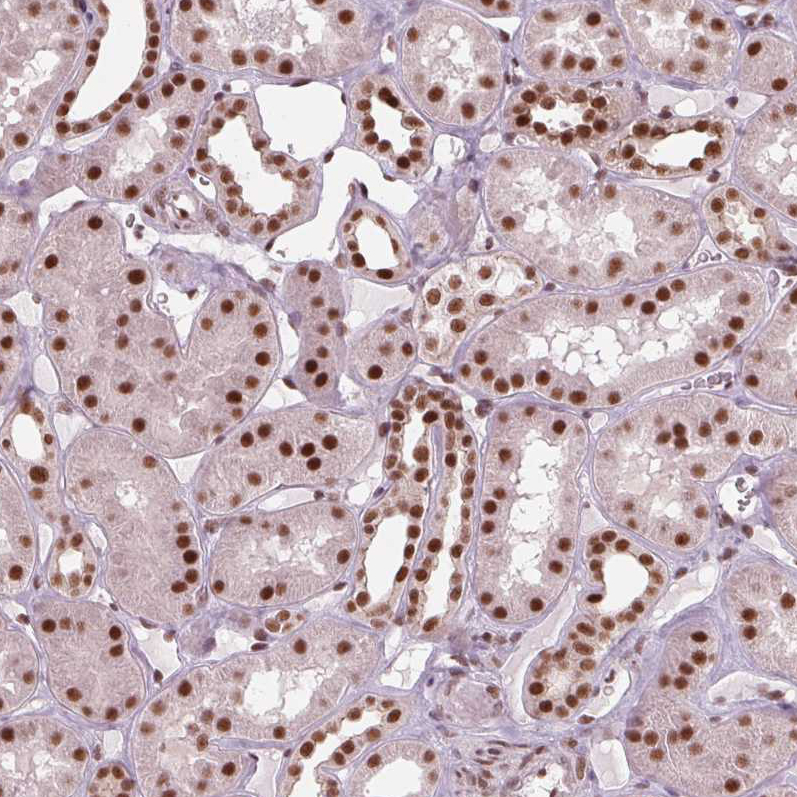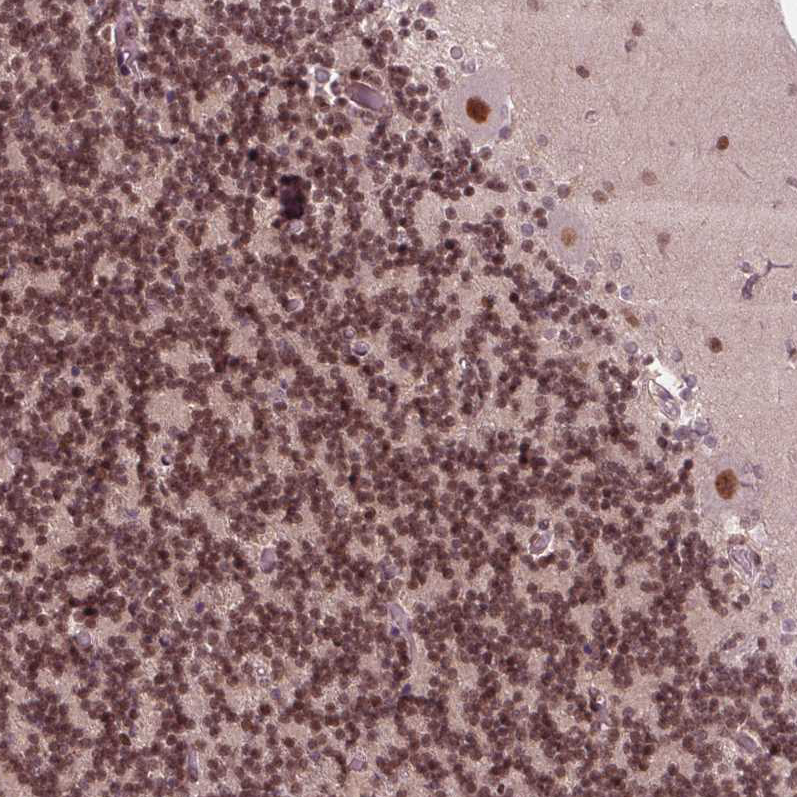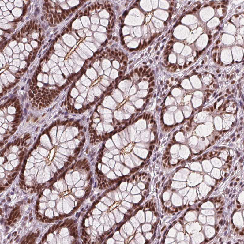 Immunohistochemical staining of human cervix shows strong nuclear positivity in squamous epithelial cells.