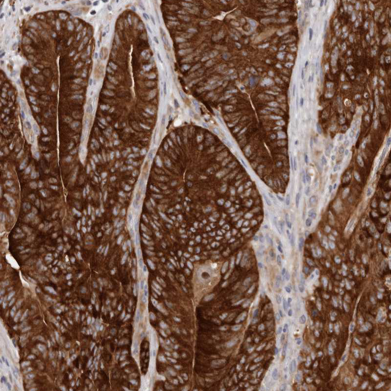 Immunohistochemical staining of human tonsil shows moderate cytoplasmic positivity in germinal and non-germinal center cells and squamous epithelial cells.