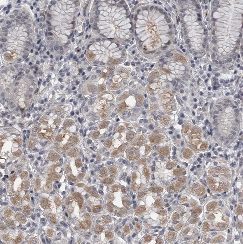Immunohistochemical staining of human liver shows moderate cytoplasmic positivity in hepatocytes.