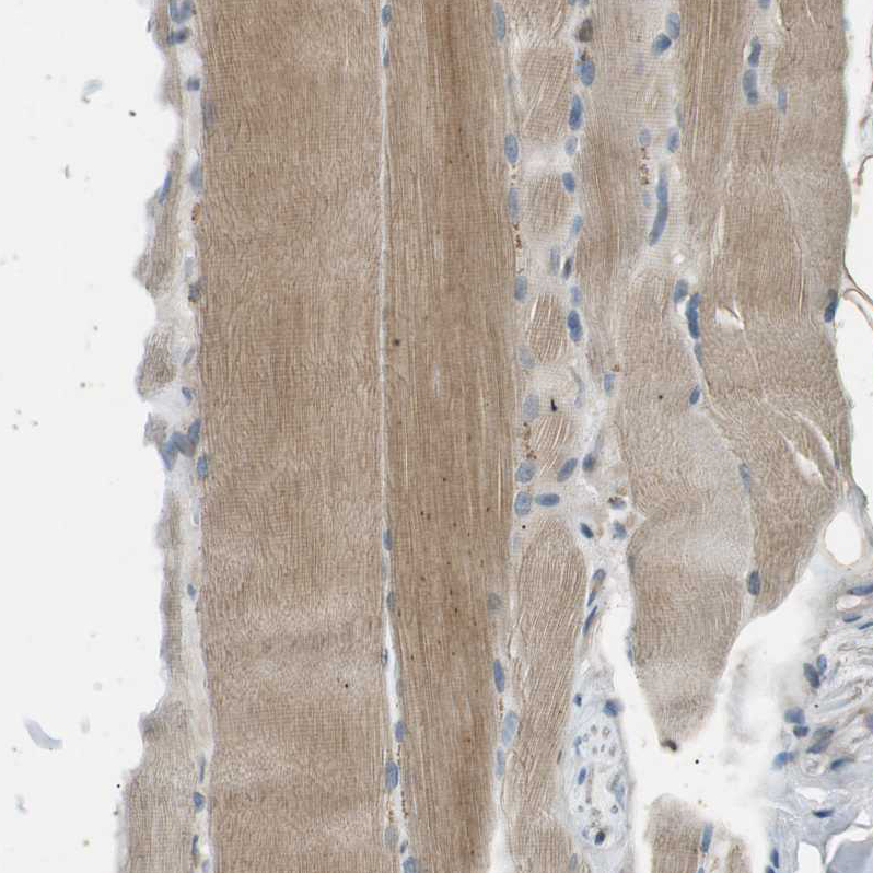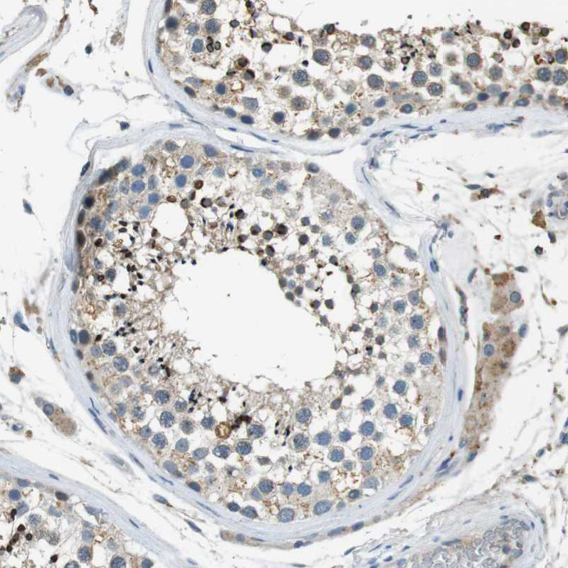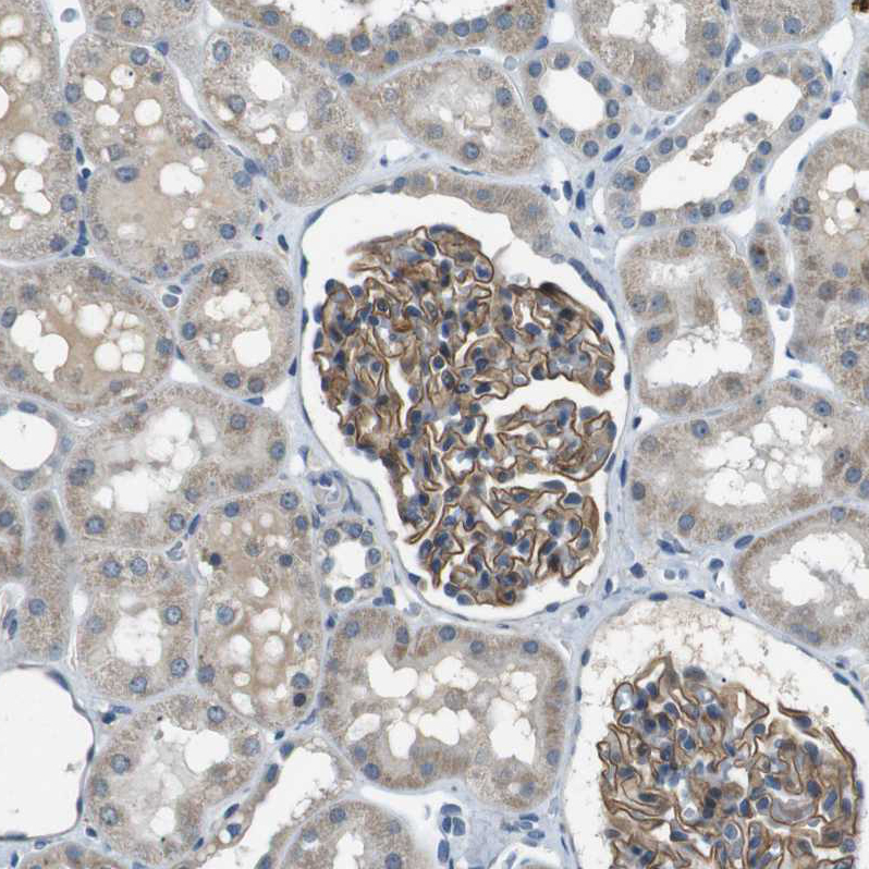 Immunohistochemical staining of human cerebral cortex shows moderate to strong cytoplasmic positivity in neurons.