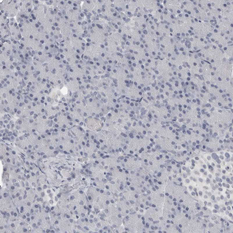 Immunohistochemical staining of human skeletal muscle shows moderate cytoplasmic positivity in myocytes.