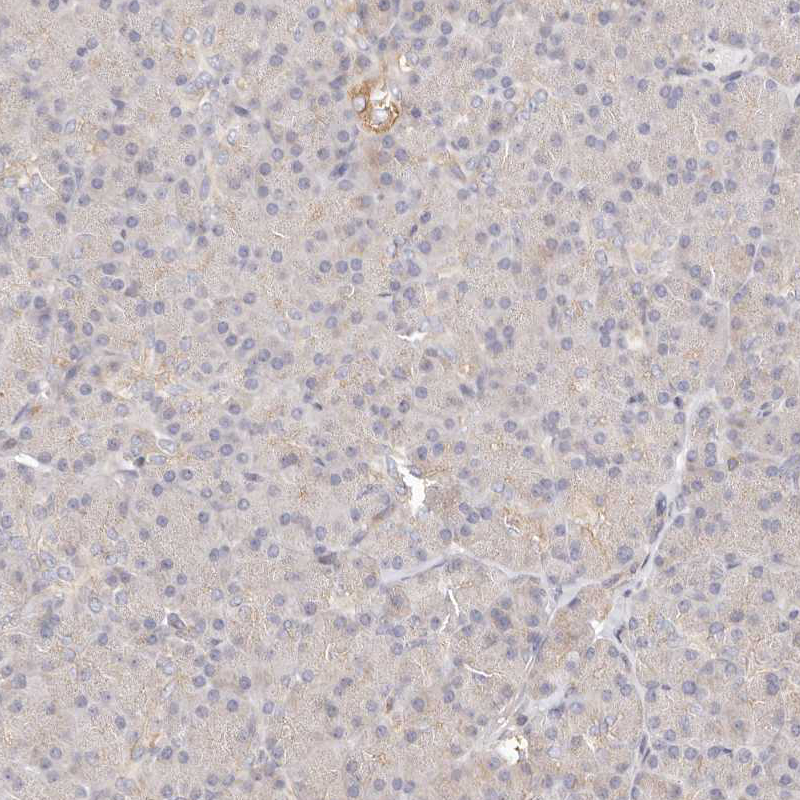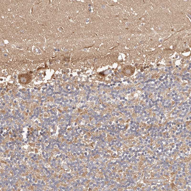 Immunohistochemical staining of human cerebral cortex shows weak cytoplasmic positivity in neuronal cells.