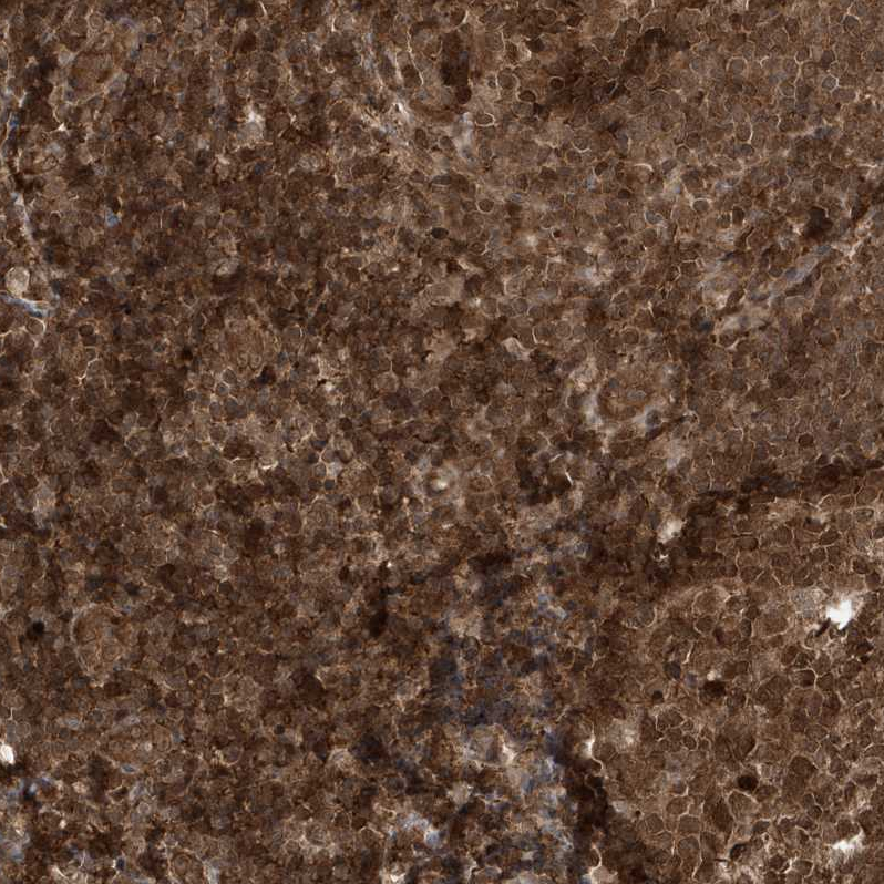 Immunohistochemical staining of human bone marrow shows moderate cytoplasmic positivity in hematopoietic cells.