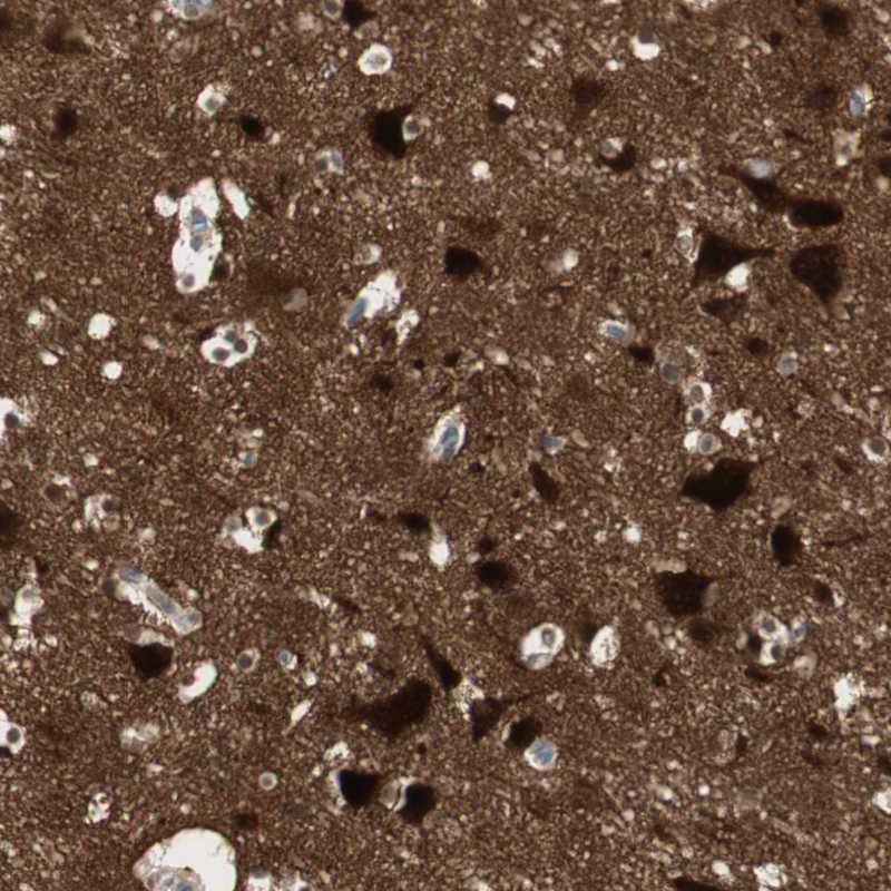 Immunohistochemical staining of human cerebral cortex shows strong cytoplasmic positivity in neuronal cells.