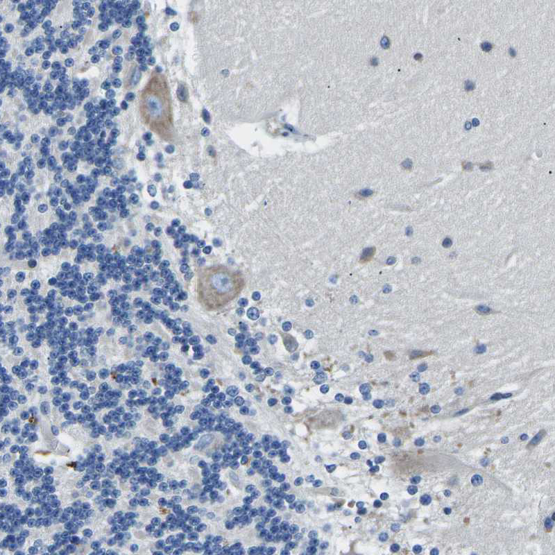 Immunohistochemical staining of human cerebral cortex shows moderate cytoplasmic positivity in neuronal cells.