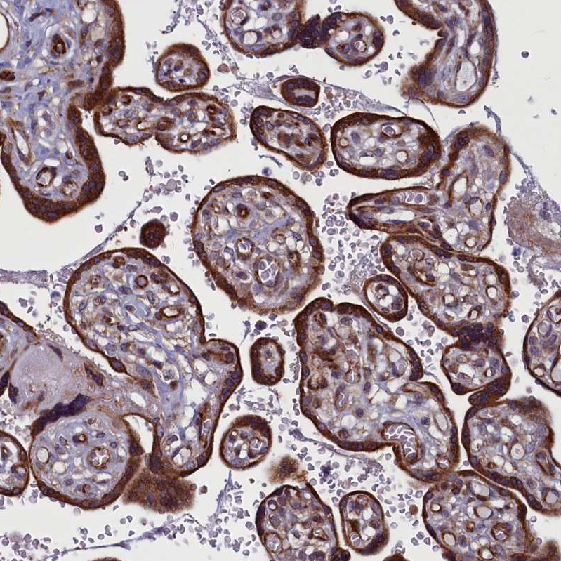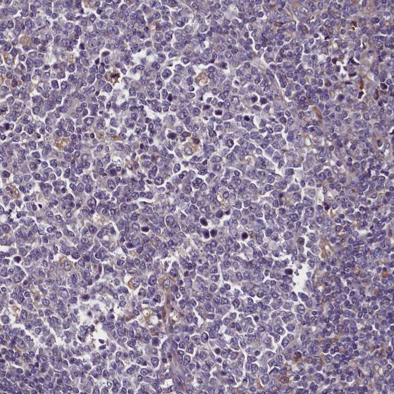 Immunohistochemical staining of human testis shows strong cytoplasmic positivity in spermatogonia.