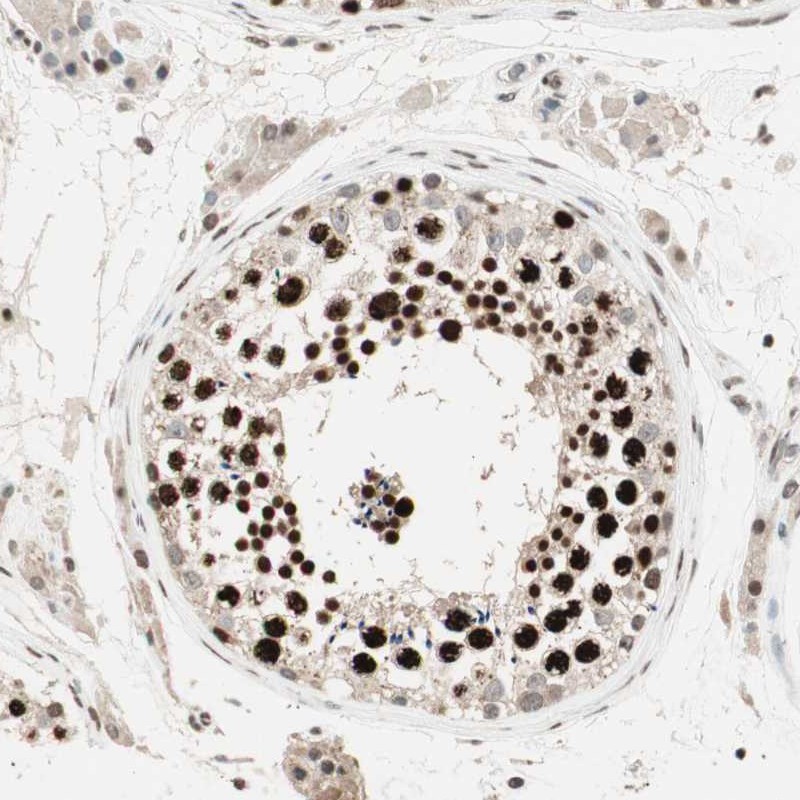 Immunohistochemistry analysis in human testis and liver tissues using Anti-MDC1 antibody. Corresponding MDC1 RNA-seq data are presented for the same tissues.
