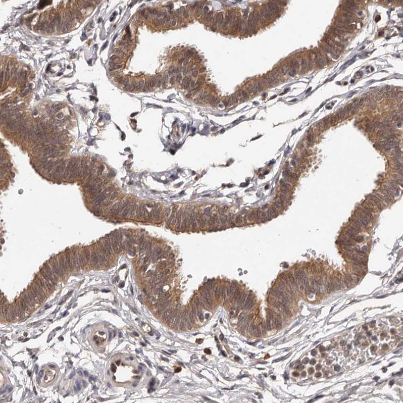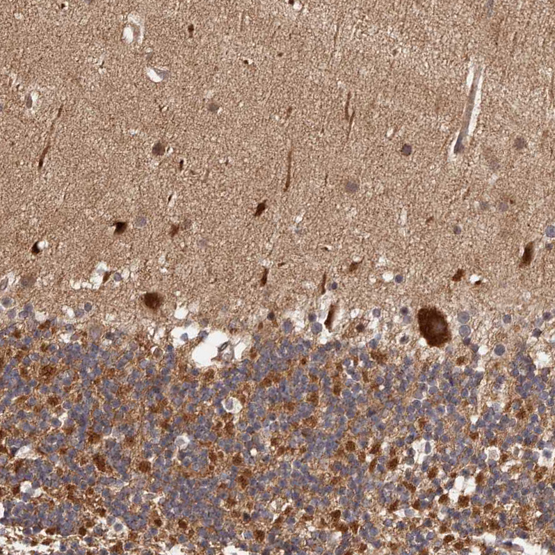 Immunohistochemical staining of human breast shows moderate cytoplasmic positivity in glandular cells.