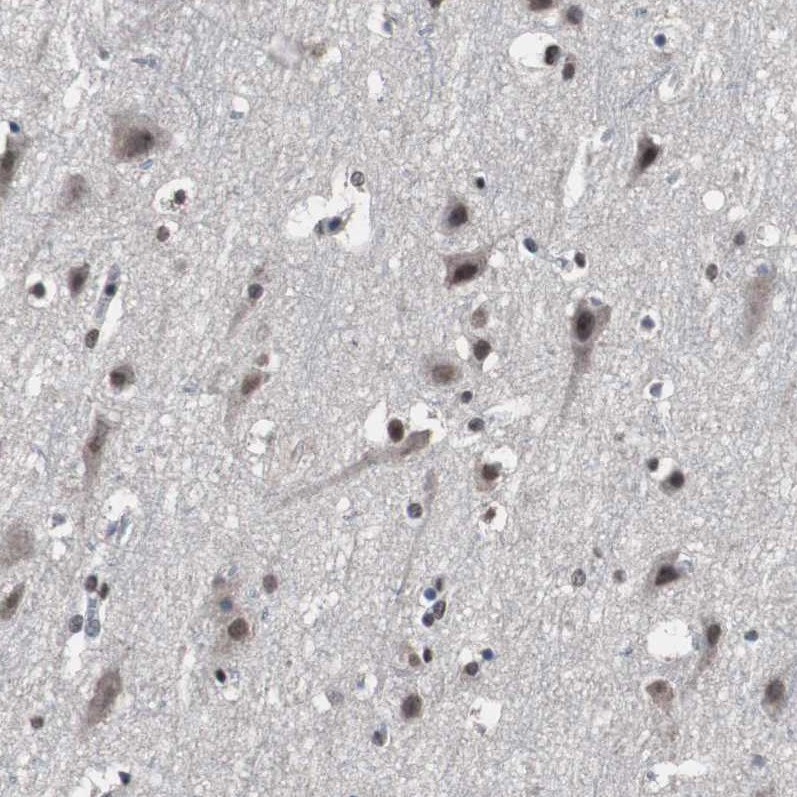 Immunohistochemical staining of human prostate shows moderate nuclear positivity in glandular cells.