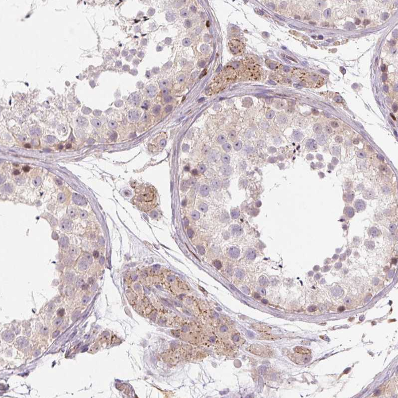 Immunohistochemical staining of human cerebellum shows strong cytoplasmic positivity in Purkinje cells.