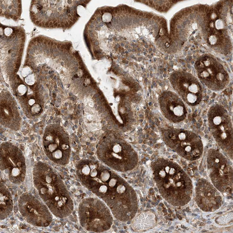 Immunohistochemical staining of human placenta shows strong cytoplasmic positivity in trophoblastic cells.