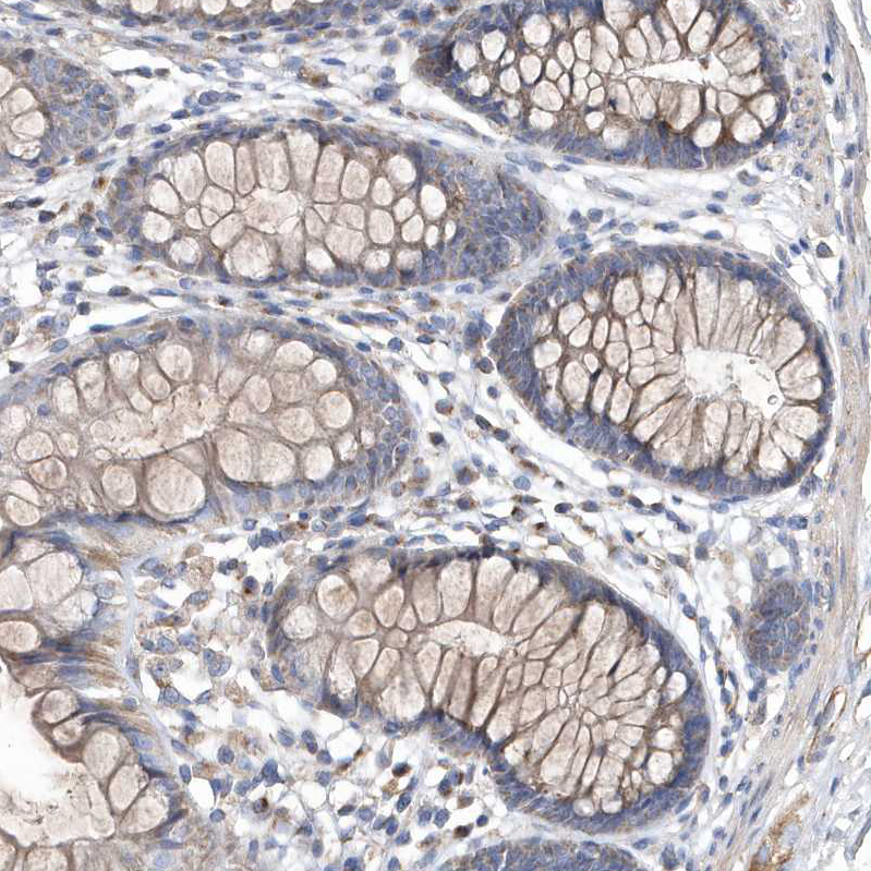Immunohistochemical staining of human kidney shows moderate cytoplasmic positivity in cells in tubules.