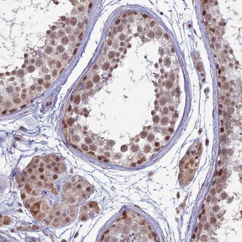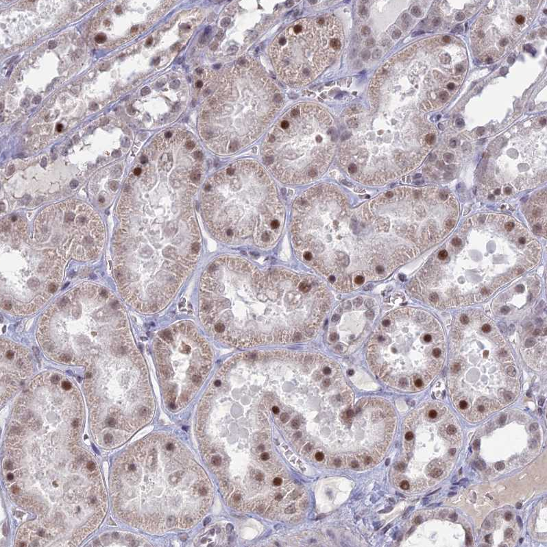 Immunohistochemical staining of human tonsil tissue shows moderate nuclear-cytoplasmic positivity in germinal center cells.