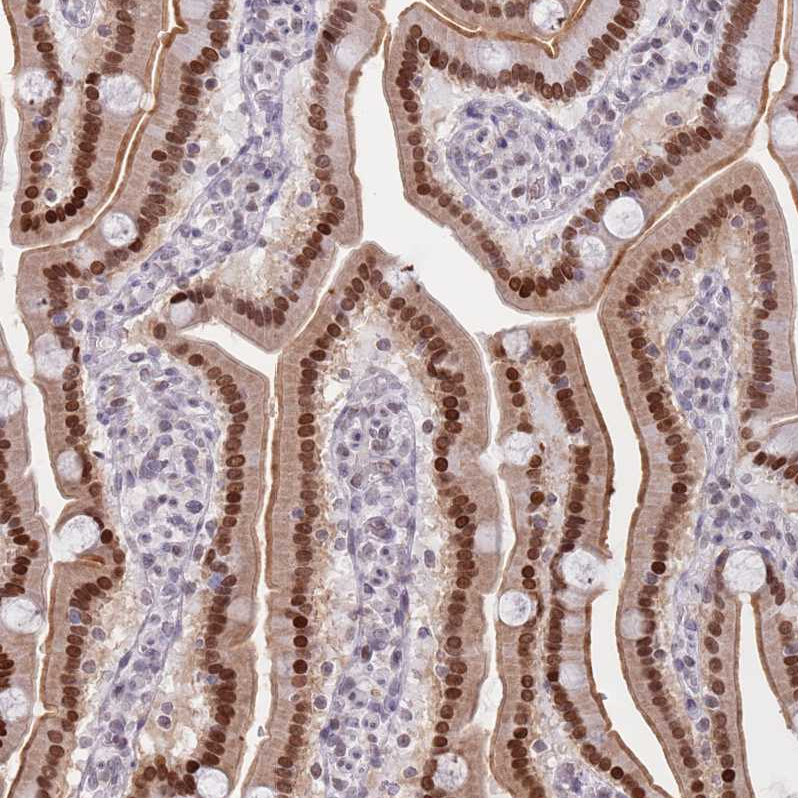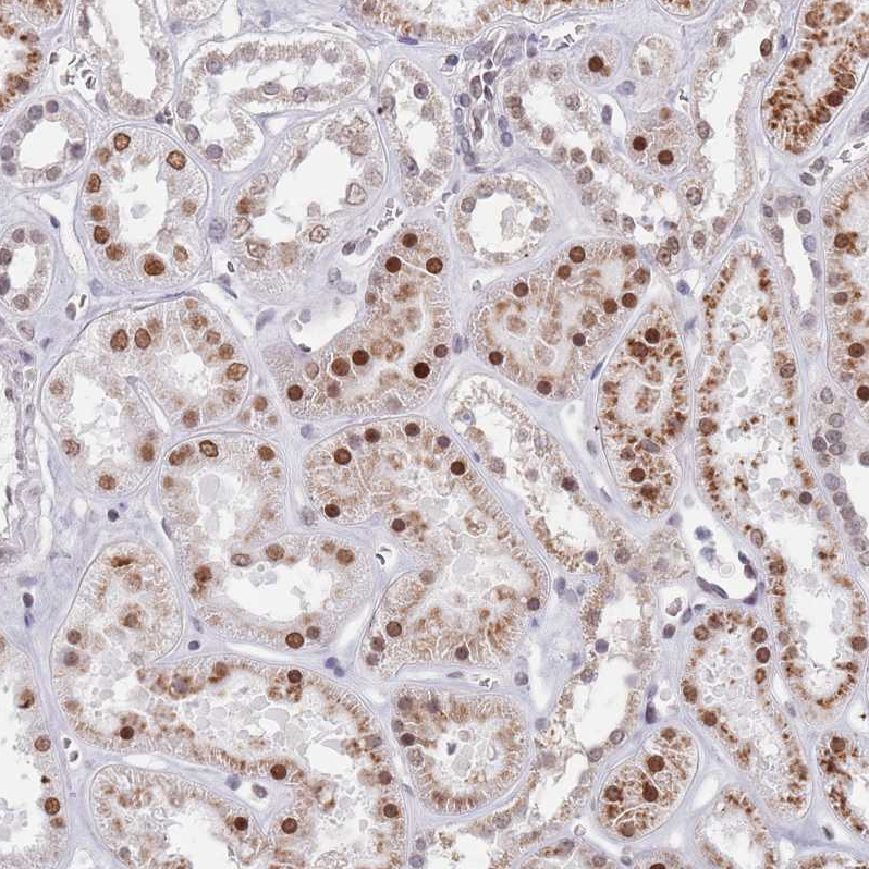Immunohistochemical staining of human skin shows moderate nuclear/nuclear membranous positivity in squamous epithelial cells.