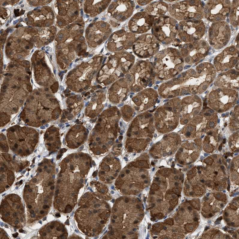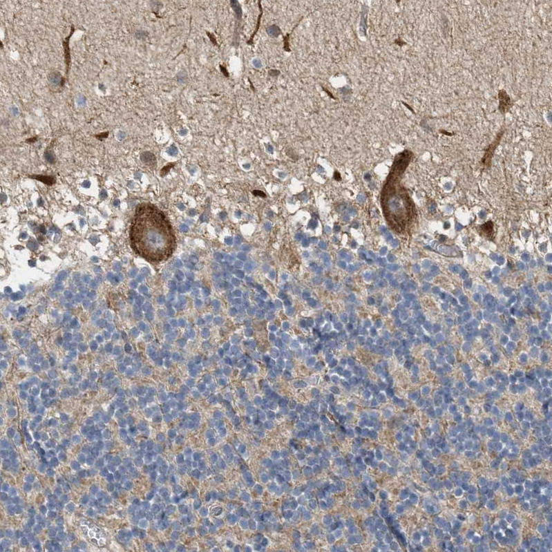Immunohistochemical staining of human cerebral cortex shows moderate cytoplasmic positivity in neuropil and nuclear positivity in neurons.