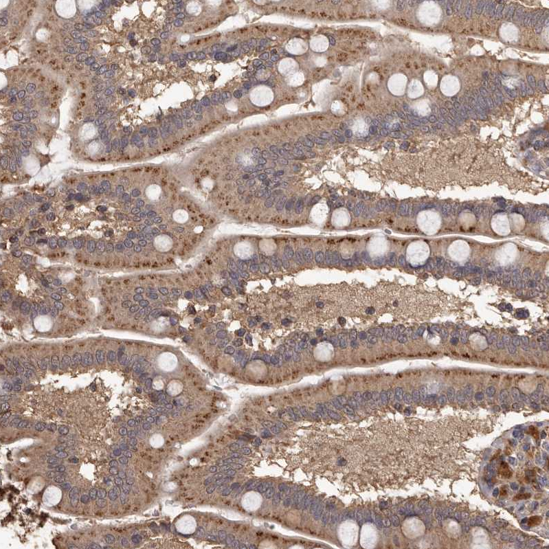 Immunohistochemical staining of human heart muscle shows strong cytoplasmic positivity in cardiomyocytes.