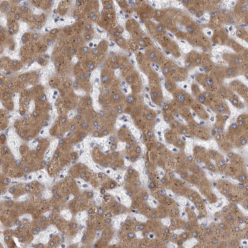 Immunohistochemical staining of human placenta shows strong cytoplasmic positivity in trophoblastic and decidual cells.