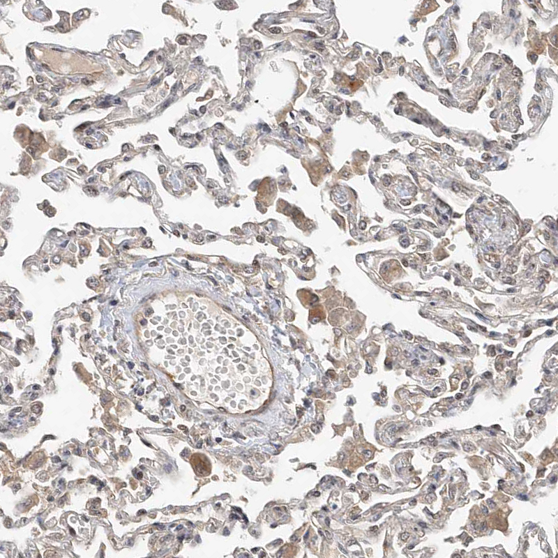 Immunohistochemical staining of human testis shows positivity in cells in seminiferous ducts.