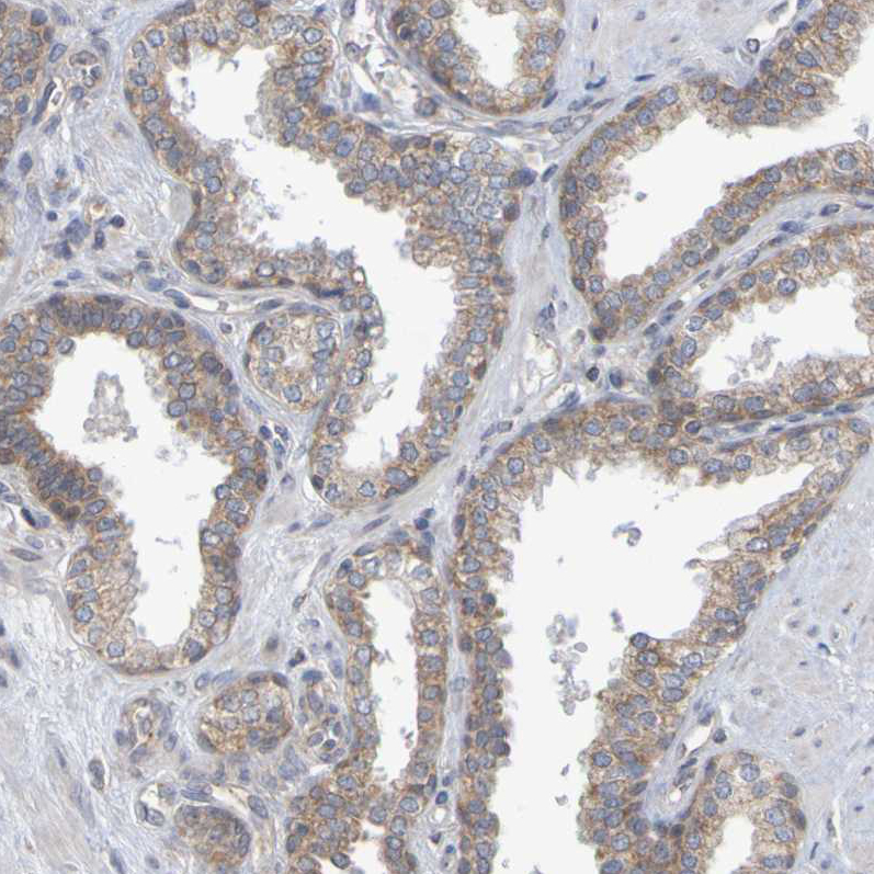 Immunohistochemical staining of human duodenum shows moderate granular cytoplasmic positivity in glandular cells.