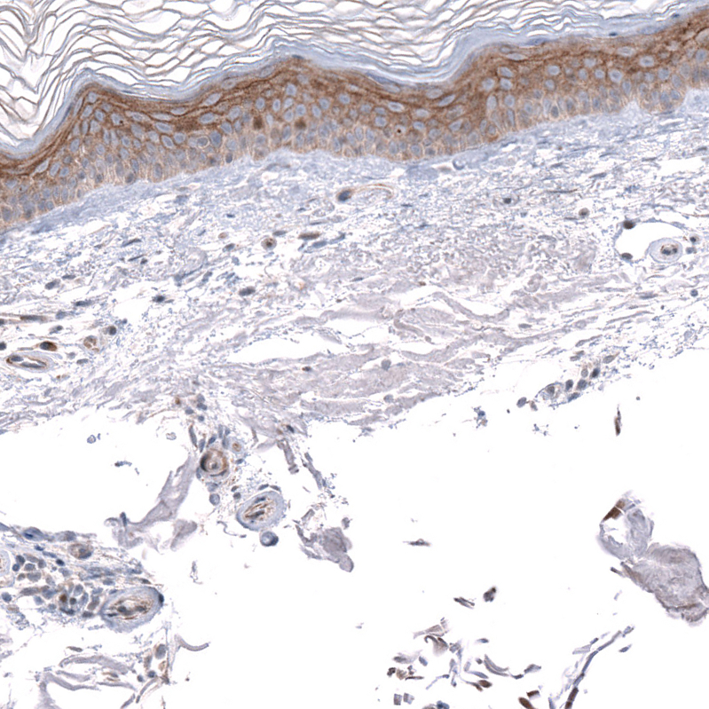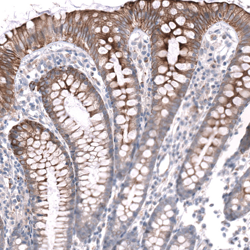 Immunohistochemical staining of human breast shows strong membranous/cytoplasmic-membranous positivity in glandular cells.