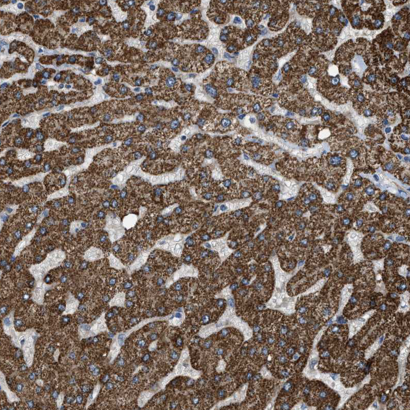 Immunohistochemical staining of human thyroid gland shows strong granular cytoplasmic positivity in glandular cells.