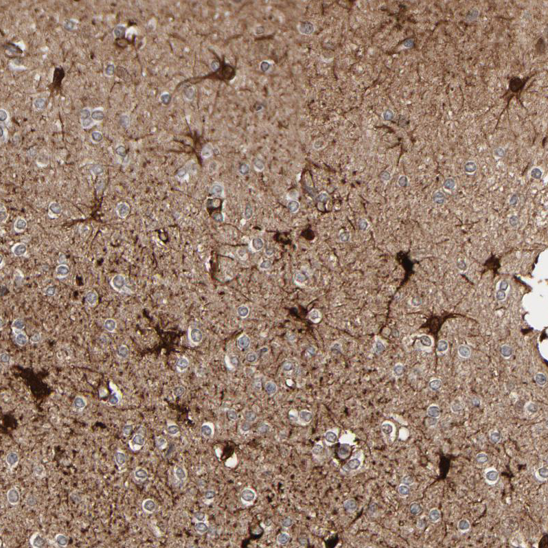 Immunohistochemical staining of human cerebellum shows very strong cytoplasmic positivity in astrocytes.